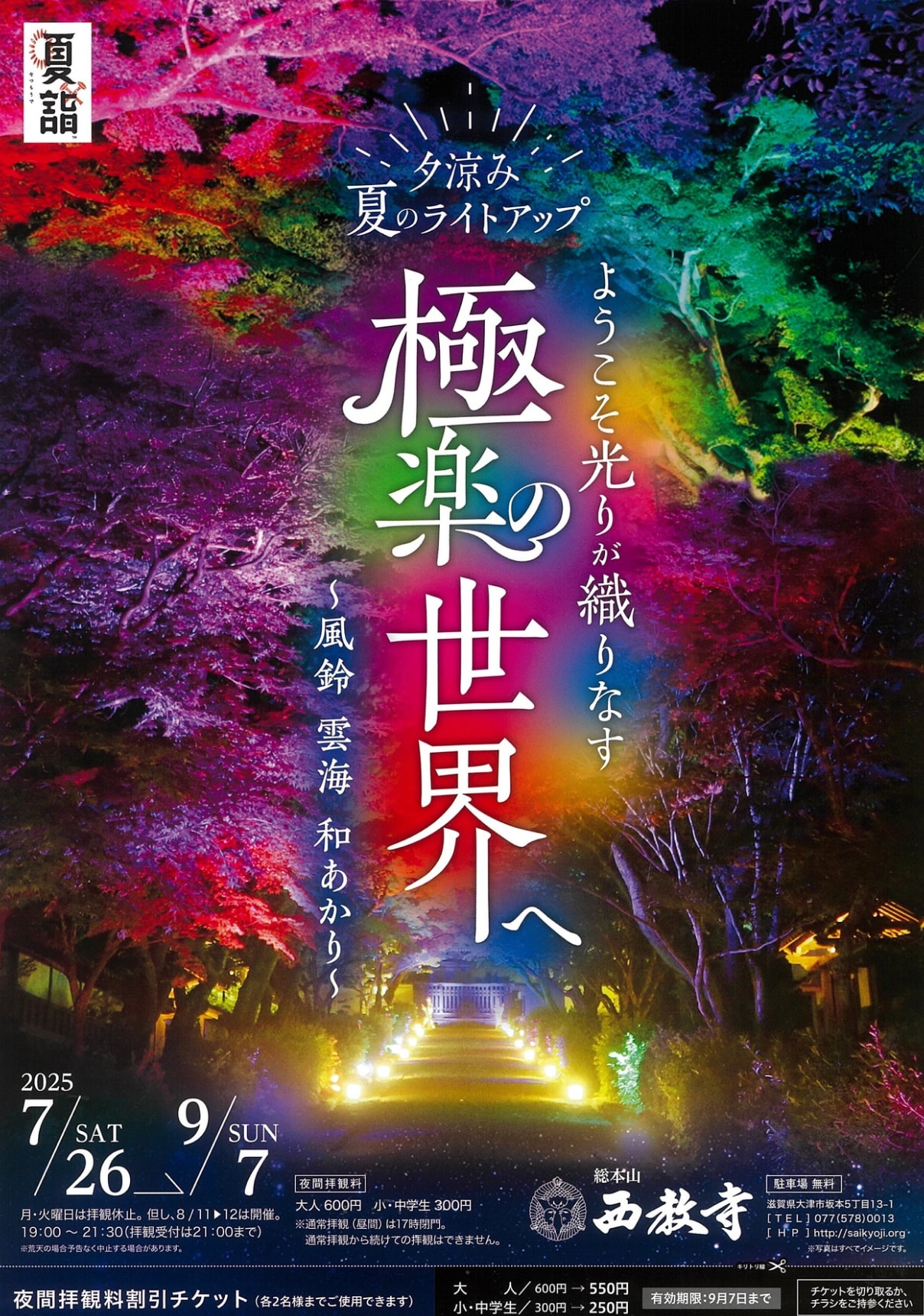夕涼み夏のライトアップ「光りが織りなす極楽の世界」を開催。昨年と違った光の演出もあり境内全体が幻想的な空間に包まれます。4000個の風鈴やサーチライト、光のハートも出現!和の光演出の数々。また、極楽の入口を思わせる光の参道(無料エリア)。盛りだくさんのライトアップ。是非、昼間と違う幻想的な夜間特別拝観。是非、ご拝観ください。