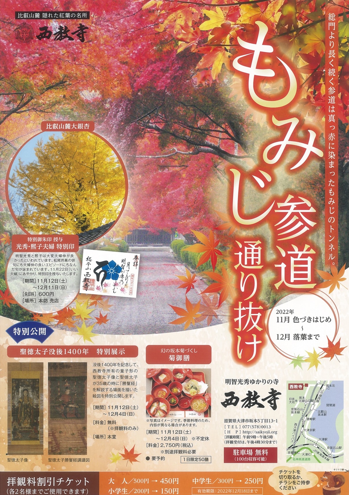 比叡山の麓に佇む西教寺では、秋の深まりとともに、境内が鮮やかな紅葉に包まれます。総門から続く参道は、赤く染まったもみじが重なり合う「もみじ参道通り抜け」として公開。紅葉の名所として知られる境内の風景に加え、特別展示や御朱印、季節限定の催しもお楽しみいただけます。秋の西教寺ならではの情景と、歴史に触れるひとときをお過ごしください。